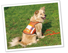 聴導犬は、試験に合格した証である「表示」を付けた、オレンジ色の「聴導犬」と書かれたケープを着用しています。聴導犬を連れている方は、聴覚に障がいのある方です。犬に対しては見つめたり、触ったりせず、パートナーの方に補助が必要な場合に、サポートをよろしくお願いします。